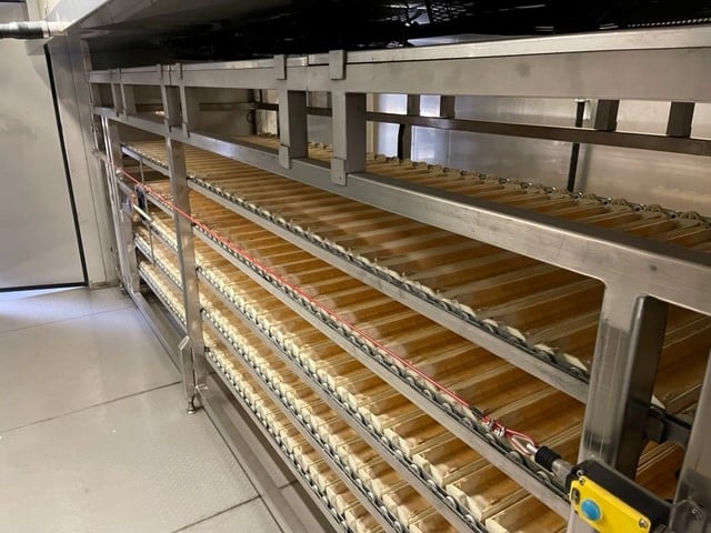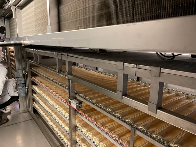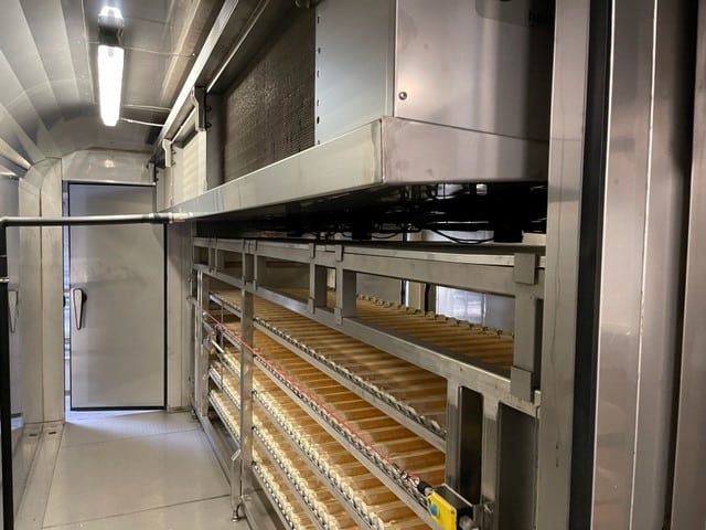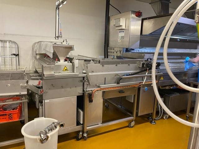 Diese Donut / Berlineranlage ist in der Lage vollautomatisch verschiedene Fettgebäcke herzustellen, unter anderem: Donuts, Berliner und andere Langgewirkte Produkte. Die Anlage beinhaltet eine vollautomatische Aufarbeitung von König mit Bypass Option falls Produkte auf Blechen hergestellt werden sollen - somit kann die Anlage auch als Brötchenanlage verwendet werden. Dazu einen automatischen Endgärschrank, Fettbackanlage made in Germany, Kühler und Verpackung.