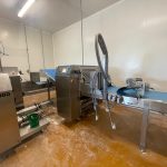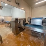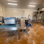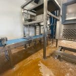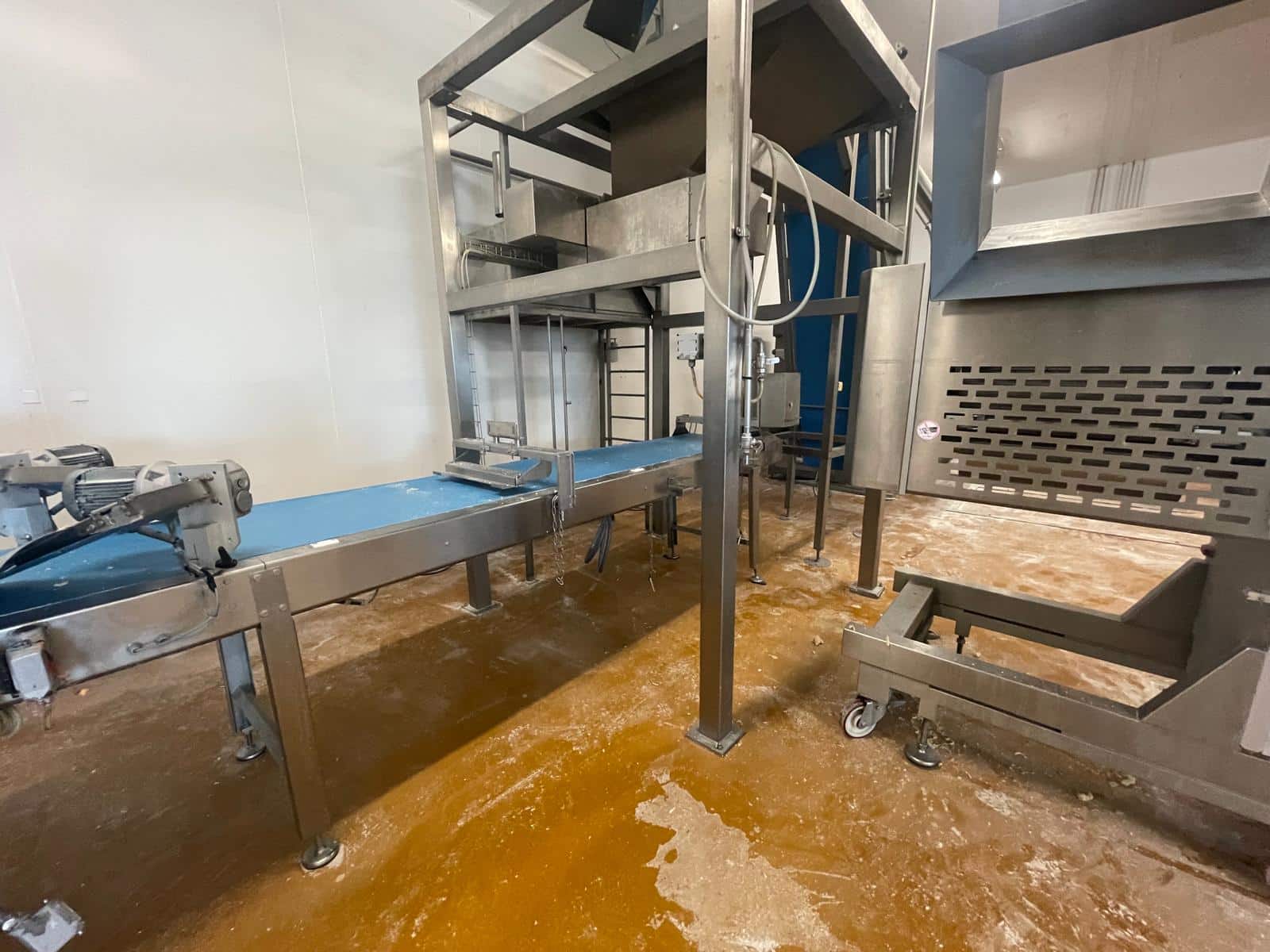 Die Anlage umfasst: Einlaufband mit Bandmehler, Faltbänder für Fett, Fettpumpe, mehrere Stationen mit Satellitenköpfen und Mehlern für eine gleichmäßige Bestäubung, sowie Faltstationen und eine Guillotine für den Endschnitt. Die Konfiguration ermöglicht einen äußerst effizienten Betrieb in kontinuierlichen, hochkapazitiven Produktionsprozessen.