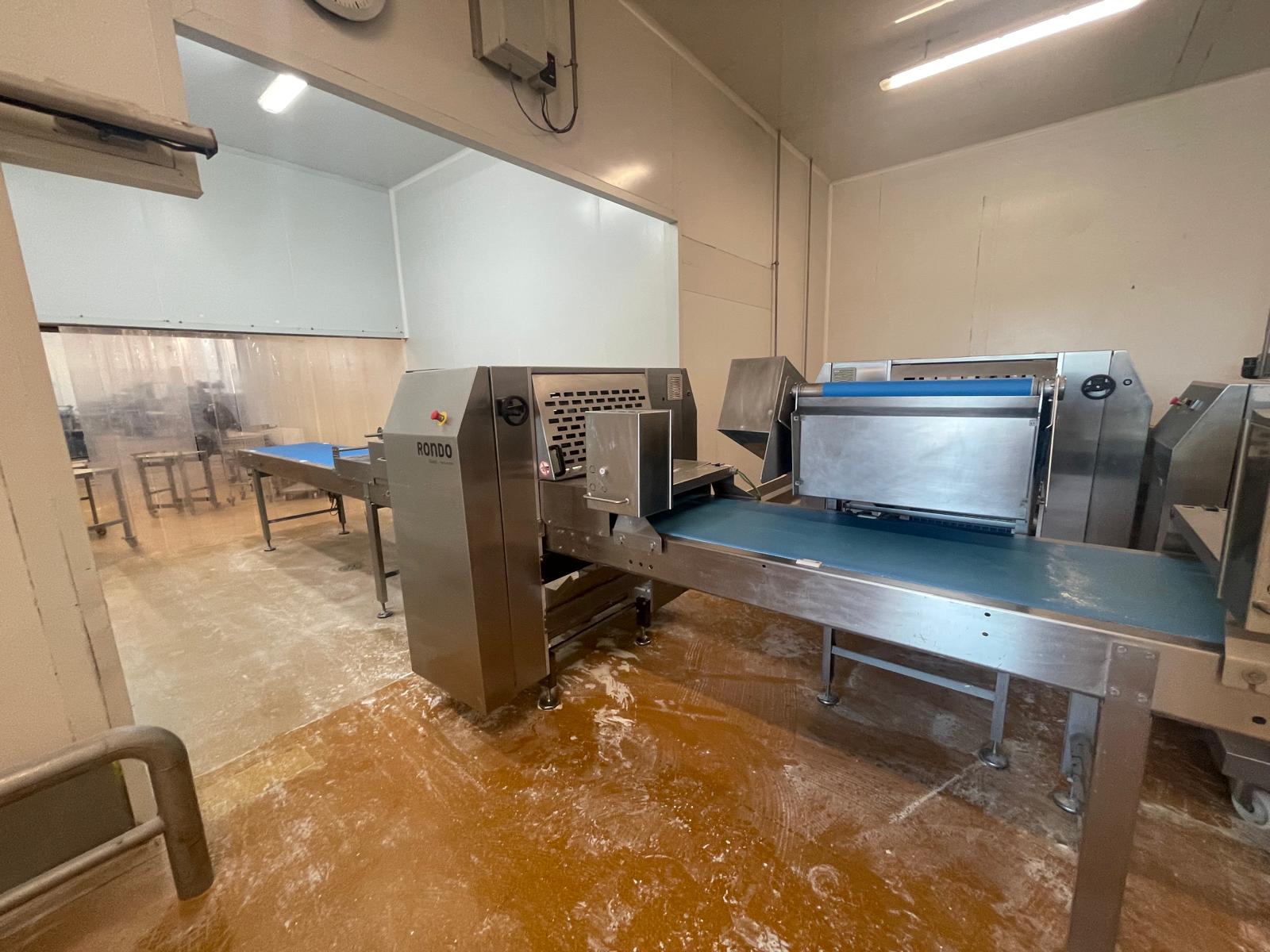 Leistungsstarke industrielle Laminieranlage, komplett generalüberholt, ideal für die Herstellung von Teigblöcken mit einer Bandbreite von 600 mm. Das Z-Layout-Design optimiert den Produktionsfluss und gewährleistet eine gleichmäßige und präzise Laminierung.
