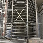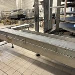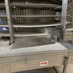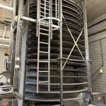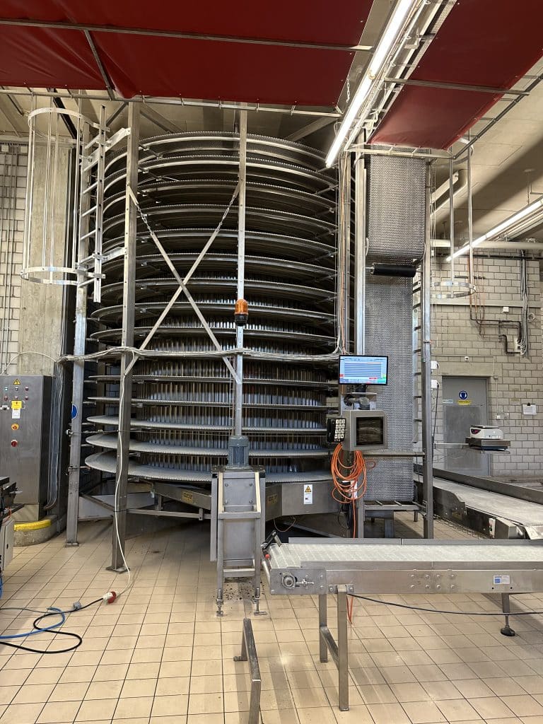 Der Meyer Spiralkühler verfügt über 15 Ebenen und ein Edelstahlband. Der Produkteinlauf befindet sich oben, der Auslauf unten, was einen effizienten und kontinuierlichen Kühlprozess in Bäckereilinien ermöglicht.