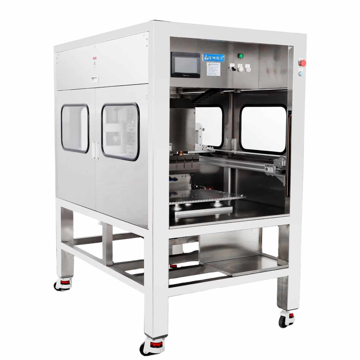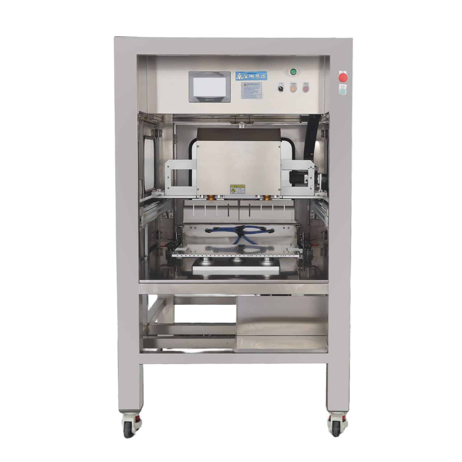 Die NHA NH302A Ultraschall-Kuchenschneidemaschine ist für Blechgrößen von 50 × 10 cm und 60 × 20 cm geeignet und kann sowohl frische als auch gefrorene Kuchen verarbeiten. Sie bietet verschiedene Schneidemethoden wie Quadrat, Dreieck, Rechteck, Rhombus und Scheiben und eine maximale Schneidehöhe von 65 mm. Die Maschine verfügt über eine automatische Messerreinigungsfunktion und eine einfache, selbsterklärende Touch-Panel-Bedienung. Hergestellt aus lebensmittelechtem Edelstahl 304, arbeitet sie mit 3,3 kW / 220 V und wird mit 1 Jahr Garantie geliefert.