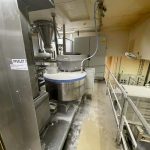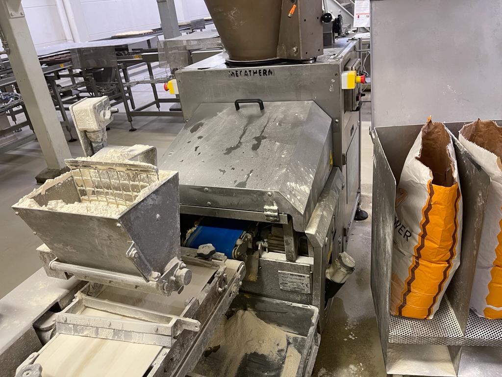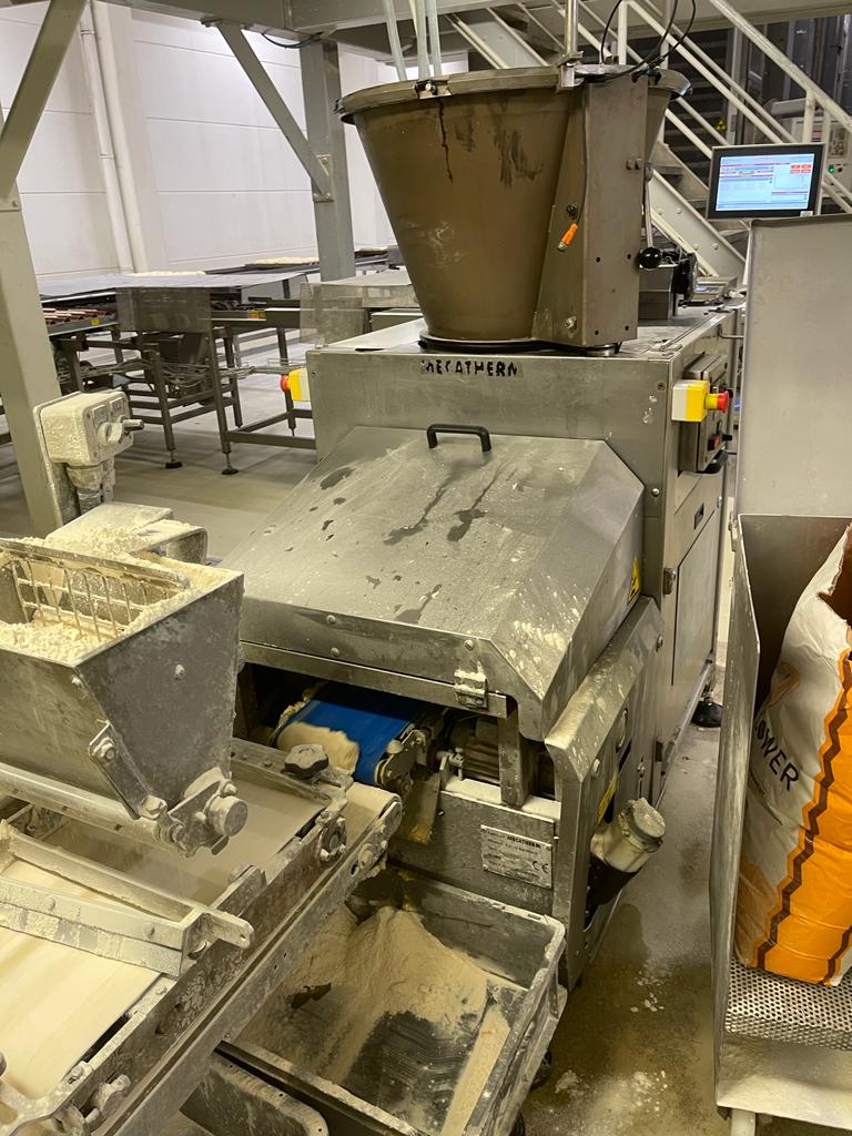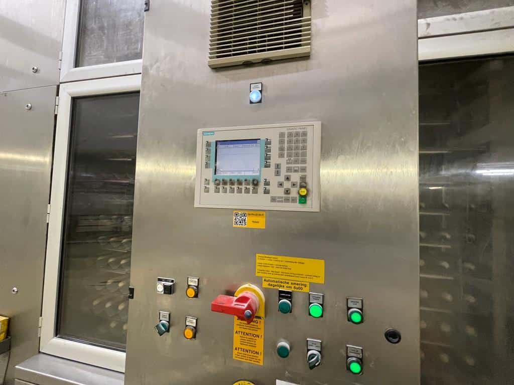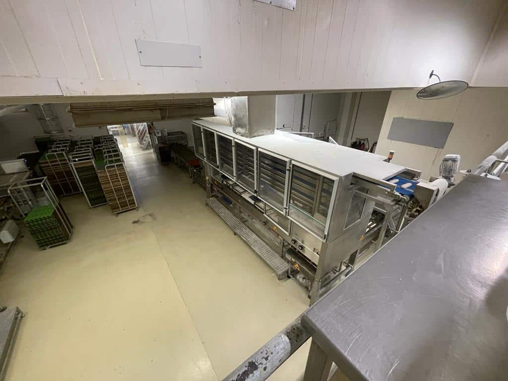This Mecatherm production line D2500 features all components neccesary for a efficient industrial scale baguette production. It features a capacity of up to 360 trays per hour, or 2500 pre proofed and frozen baguettes (if used with 7 row trays).