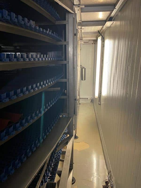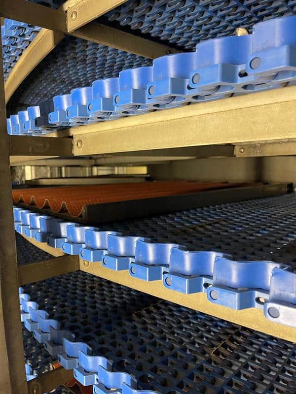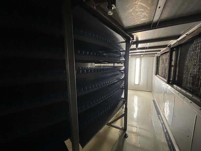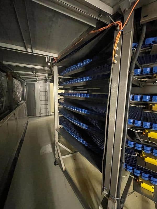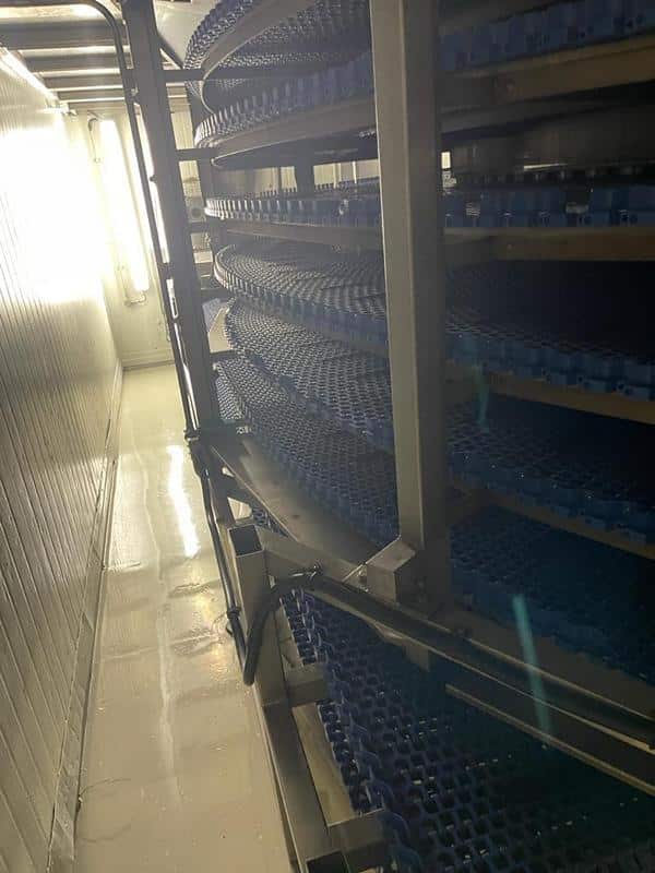 Triphase spiral freezer, designed with an 800 mm working width belt and featuring an evaporator. This freezer comes complete with a housing and utilizes a plastic belt with side guides which has been replaced 2 years ago, making it ideal for accommodating trays.