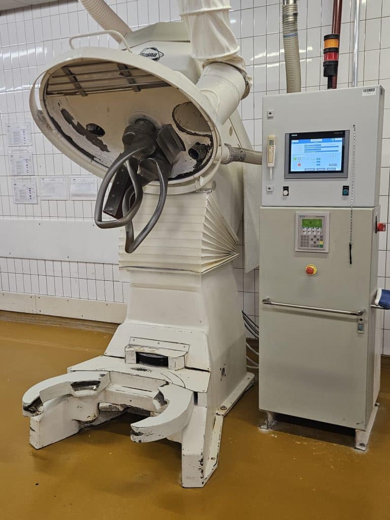 High-performance spiral mixer Diosna W240A with a capacity of 240 kg of dough, perfect for industrial production. Includes 3 removable bowls per mixer, separate control cabinet, and Siemens HMI control panel for efficient operation. Features 2 mixing speeds, 2 timers, bowl friction wheel drive, and hydraulic bowl locking. Ready for silo dosing and comes equipped with a bowl scraper for consistent mixing results.